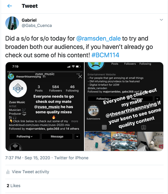 Additionally, I’ve also used this platform to my advantage in attempting to expand my already current audience and us it as a remediation. I’ve done this through engaging with fellow bcm114 students, as shown below whereby we initiated shutouts for both our pages, enabling both our brands to expand on our audience’s.