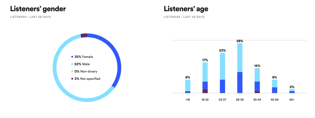 Though in terms of unpacking my audience and using this to my own benefit when producing my music, Spotify for artists is also a great platform which has provided me with very useful analytics into what my audience is engaging with and which tracks of mine they favour. The platform breaks this down by age, gender, geographic location, sources of stream and listening history.