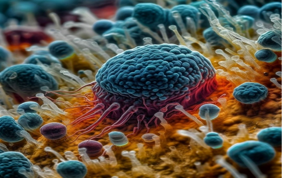Figure 1. A digital microscopic view depicts strange, fluorescent, single-celled lifeforms with unconventional cellular structures and geometries, suggesting an alien biochemical makeup.